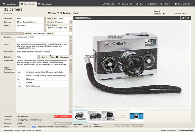 Photographica is a database with which to document ones’ photographic equipment and ephemera. You probably have information scattered about in spreadsheets, in word processor documents, on bits of paper, old brochures, web browser bookmarks and possibly on post-it notes.