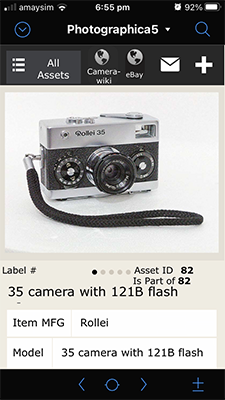 Photographica has an easy to use intuitive interface which helps you organise your collections by maker, model and user defined categories. You can add multiple pictures, documents and web links to your items, as you go along. It contains an address book for your contacts, buyers, agents or sellers. It can also document loans, repair costings and profit/loss. It also includes dedicated pop-up browser windoes to automatically search sites (Camera-wiki, Wikipdia and eBay) for the item yu are currently viewing. |